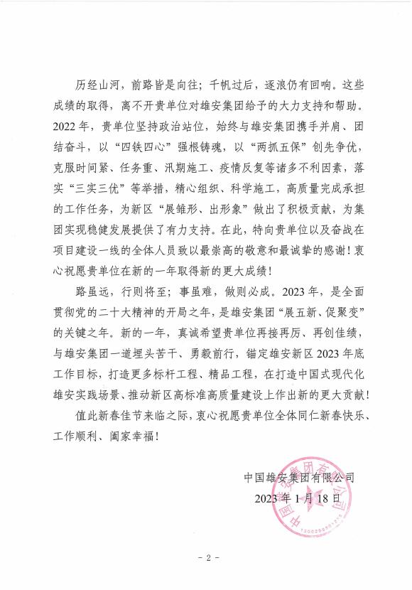 近日,建研正方公司收到雄安集團發來的感謝信,對建研正方公司2022年為雄安新區發展建設所做出貢獻表示感謝。